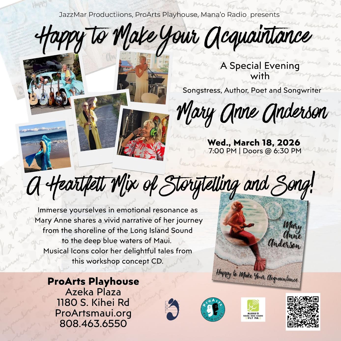 Mana’o Radio and ProArts Playhouse are pleased to present and evening with Mary Anne Anderson.