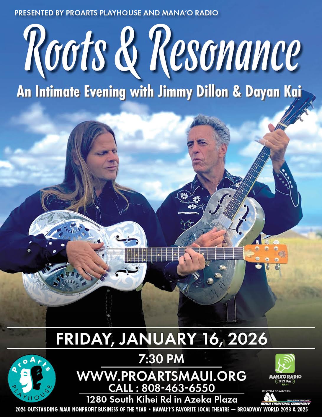 Roots & Resonance: An Intimate Evening with Jimmy Dillon & Dayan Kai at ProArts, Friday, January at 7:30pm
